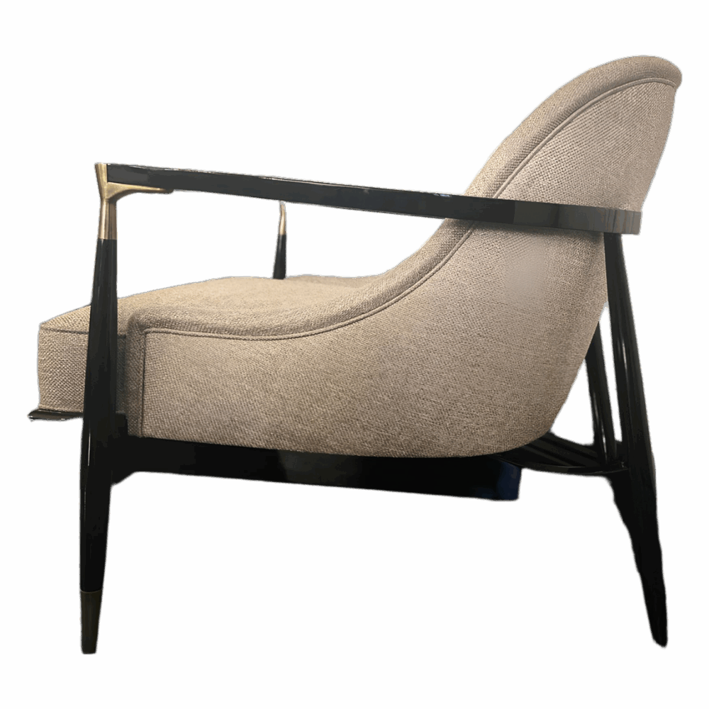 The Morini Modern Luxury Armchair is designed to bring refined sophistication to any contemporary space. Featuring a glossy black wooden frame and brass-finished armrest details, it combines clean architectural lines with a soft, inviting seat. The beige fabric upholstery creates a warm, neutral tone that complements both classic and modern interiors.