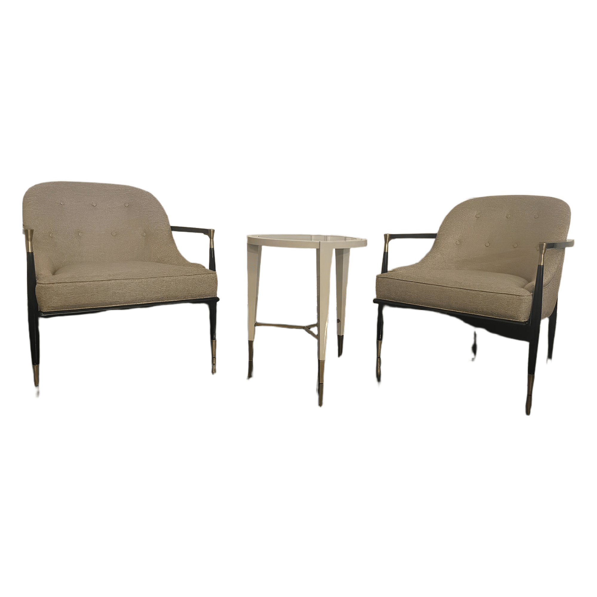 Elegant modern armchairs, featuring a glossy black wooden frame with brass details on the armrests and grey-beige fabric upholstery, perfect for adding a touch of sophistication to any space. Size: 76*90*83 H cm.